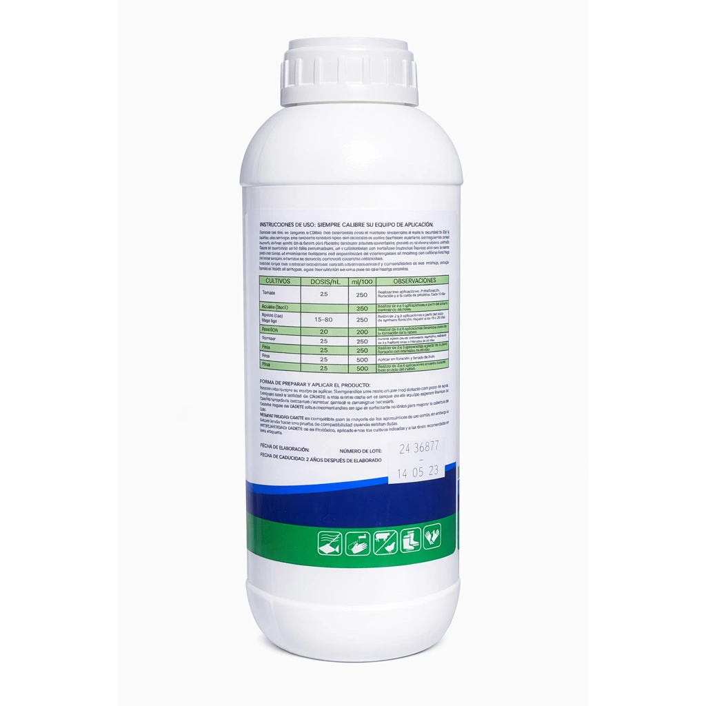 Siempre calibre su equipo de aplicación cadete es un complejo líquido formulado principalmente con el nutriente secundario calcio y complementado con nitrógeno y micronutrientes por su contenido cadete estimula el desarrollo de hojas y raíces forma compuestos en las paredes celulares de la planta activa diversos procesos enzimáticos neutraliza ácidos orgánicos estimula la disponibilidad de molibdeno y es esencial para las bacterias fijadas de nitrógeno ayuda a superar situaciones de estrés tales como frío calor heladas debido a la escasa movilidad del calcio en los tejidos vegetales los síntomas comunes de su deficiencia puede ser un pobre crecimiento de raíces tornándose negras y se pudren en hortalizas el follaje nuevo presenta aspectos gelatinoso y en los frutos se desarrolla pudrición apical en frutales las hojas jóvenes se desarrollan deformes y con márgenes irregulares ondulados y curvados hacia abajo en forma de gancho además pueden mostrar manchas o áreas necróticas cadete puede aplicarse al follaje de cultivo al suelo en fertirriego siguiendo siempre un programa de nutrición balanceado.