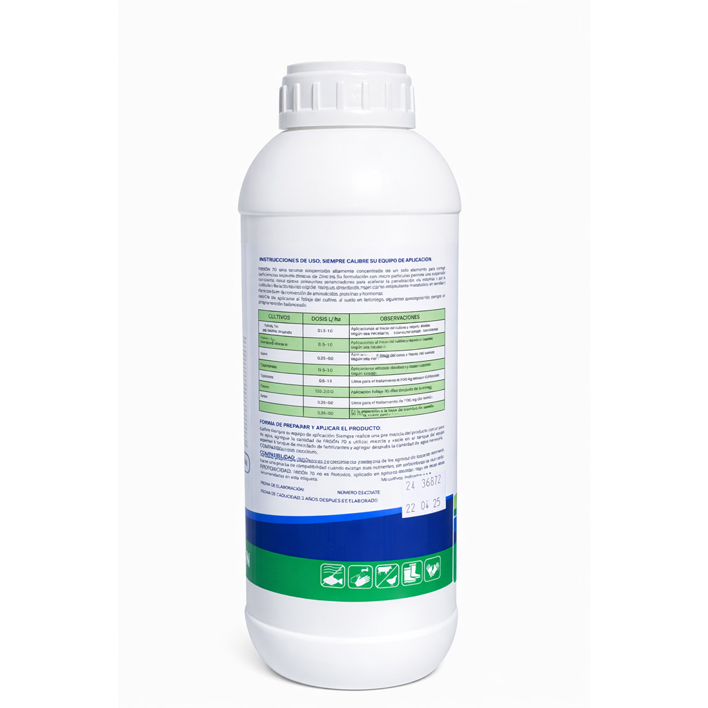Frisón 70 es una suspensión altamente concentrada de un solo elemento para corregir deficiencias específicas de zinc su formulación con micropartículas permite una suspensión constante contiene agentes potenciadores para acelerar la penetración vía estomas y por la cutícula de la hoja El zinc tiene un importante papel como estimulante metabólico en semillas y partículas donde activa enzimas importantes para el desarrollo radicular participa también en la conversión de aminoácidos proteínas y hormonas frison 70 puede aplicarse al follaje del cultivo al suelo en fertirriego siguiendo siempre un programa de nutrición balanceado.
