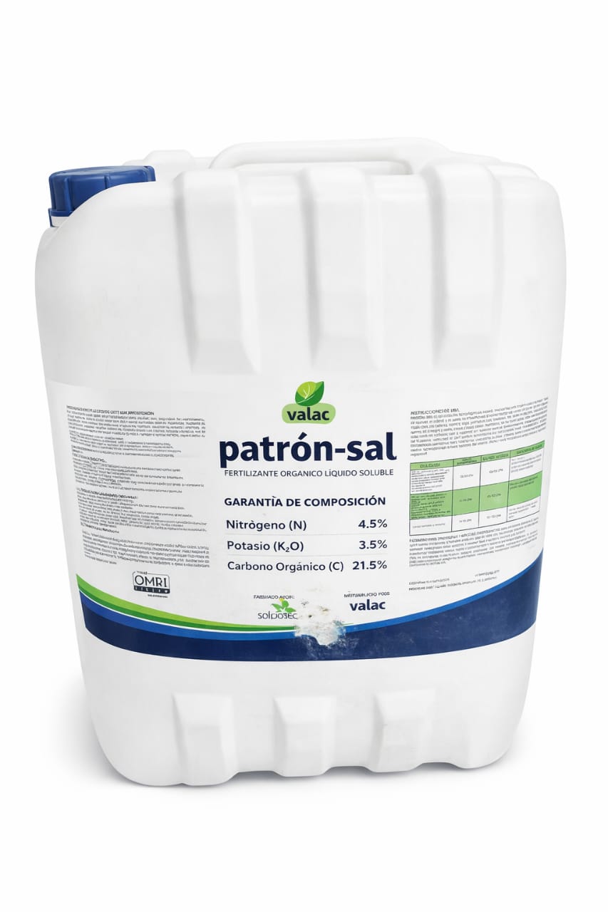 PATRÓN SAL es un producto tecnológico que integra una fracción orgánica de alta calidad, capaz de aportar al cultivo y al suelo una multitud de sustancias biológicas activas, como ácidos orgánicos, moléculas de cadena corta y larga, polisacáridos, betaínas, entre otras. Estas sustancias constituyen un aporte de energía a corto, mediano y largo plazo. Asimismo, dichas sustancias, junto con una proporción adecuada de carbono, suponen un sustrato ideal para el desarrollo de la vida microbiana en el suelo y, de manera particular, en la rizosfera, ecosistema de vital importancia para el correcto desarrollo del sistema radicular y, por ende, del cultivo. Se recomienda realizar aplicaciones periódicas para mantener una alta actividad biológica y efectos positivos sobre el suelo y la planta. Su excelente solubilidad lo hace sencillo de usar e idóneo para incluirse en programas de nutrición vegetal.